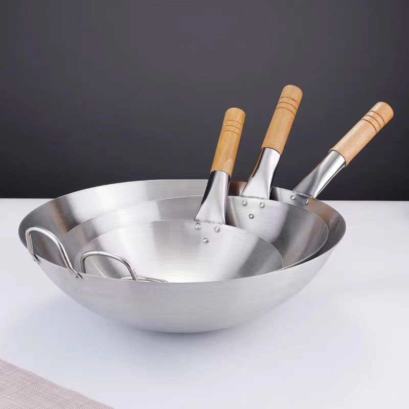 Stainless Steel Wok Stir Fry Pans Round Bottom Wok Traditional Wok Pan Household Wok with Wooden Handle